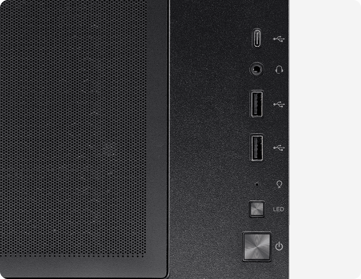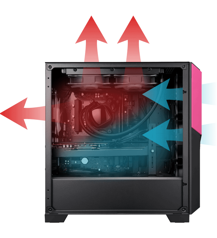 正面がメッシュ(網目)状になっていて、空気が通りやすい作りです。最大6個のファンを取り付けられ、長時間ゲームをしてパソコンが熱くなっても効率よく冷やしてくれます。熱による故障や性能低下を防ぐ安心の設計です。