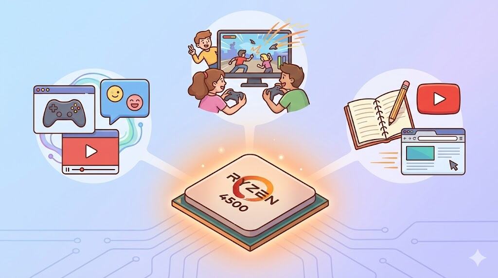 このパソコンの頭脳である「Ryzen 5 4500」について解説します。価格は抑えつつ、ゲームや普段使いに必要な性能をしっかり持っている、コスパ抜群のCPUです。