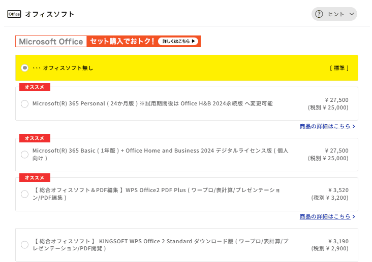 ゲーミングPCなので、基本は標準の「無し」で大丈夫です。学校の課題などでWordやExcelがどうしても必要な人だけ追加しましょう。実は、無料で使えるGoogleのツールでも代用できることが多いです。必要になったら後から買うこともできるので、まずは「無し」にして予算を抑えるのが賢い選び方です。