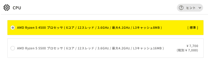 標準の「Ryzen 5 4500」で、このパソコンの性能を十分に引き出せます。プラス7,700円で上位の「5500」に変更できますが、ゲームの快適さは主にグラフィックボードの性能で決まります。もし将来的にグラフィックボードを換装する予定がある場合はアップグレードしておくのもありです。