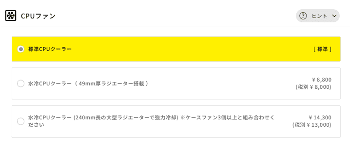 このパソコンのCPUは発熱が少ないため、追加費用の掛からない「標準CPUクーラー」で十分に冷やせます。水冷クーラーは見た目がよくなりますが、ゲームの動きが速くなるわけではありません。まずは標準のまま購入して、浮いた予算を好きなゲームや周辺機器に使うのがおすすめです。