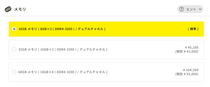 ゲームをするなら標準の「16GB」で十分足ります。32GBに増やすには約4万5千円もの追加料金がかかり、パソコン本体の価格に対して割高です。16GBあればApexやフォートナイトなどの人気ゲームも快適に動くので、無理に増やす必要はありません。浮いたお金を周辺機器などに使うのがおすすめです。