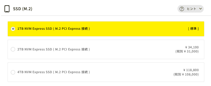 標準で「1TB」という大容量が入っているので、カスタマイズ不要です。これだけあれば、Apexやフォートナイトなどの人気ゲームを10本以上入れても余裕があります。2TBに増やすと約3万4千円も高くなってしまうので、もし将来容量が足りなくなったら、その時に外付けSSDなどを買い足す方が安上がりでおすすめです。
