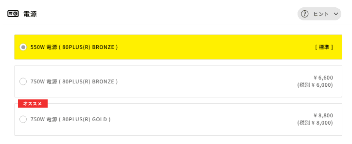 標準の「550W」で十分な容量があり、このパソコンを動かすのに全く問題ありません。もし将来、もっと消費電力の高い高性能なパーツに入れ替える予定があるなら「750W」にするのもアリですが、基本的にはカスタマイズ不要です。そのままの構成で安心して使えます。