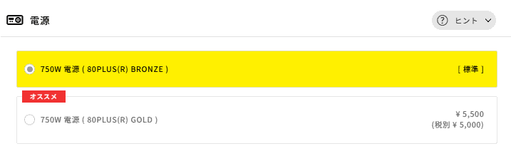 標準の「750W BRONZE」で容量は十分です。もし予算に余裕があり、毎日長時間パソコンを使うなら、電気の無駄が少なく省エネな「GOLD」ランクへの変更(+5,500円)もおすすめです。電気代の節約につながり、部品の寿命も長持ちしやすくなりますが、迷ったら標準のままでも全く問題ありません。
