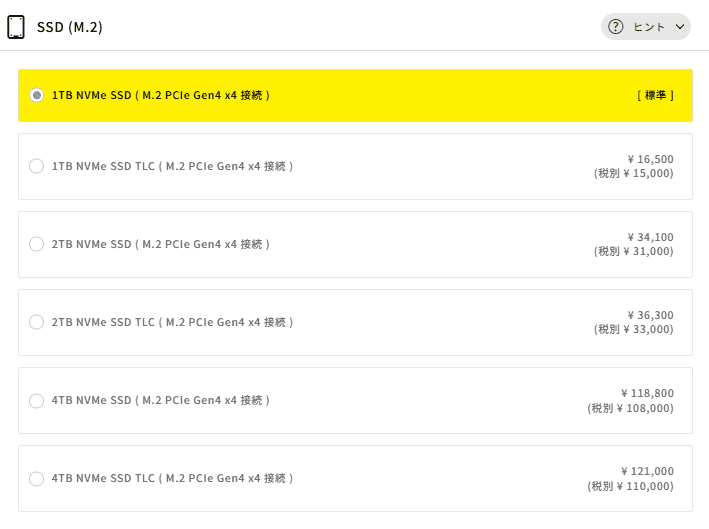 標準の「1TB」で十分な容量があります。最近のゲームはデータサイズが大きいですが、これなら主要なタイトルを10本以上は余裕で保存できます。データの読み込みも非常に速いタイプ(Gen4)が採用されているため、ゲームの起動やロード時間も快適です。まずは標準のままで始めて、将来足りなくなったら外付けなどを検討するのが賢いです。
