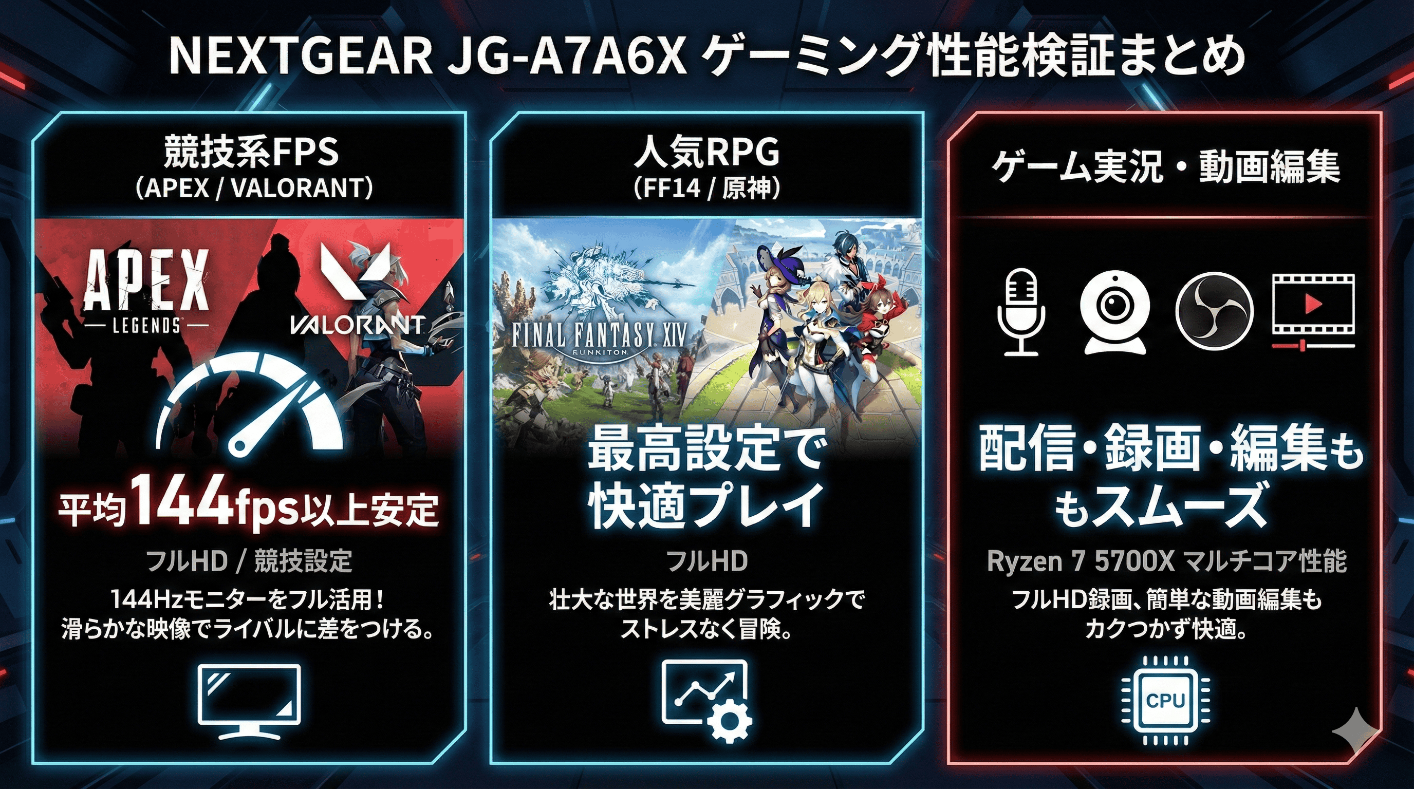 NEXTGEAR JG-A7A6Xは、ゲーミングPCに求められる「快適なゲーム体験」「将来性」「所有欲を満たすデザイン」、そして「安心のサポート」を高次元で満たしながら、15万円台というコストパフォーマンスを実現したモデルです。