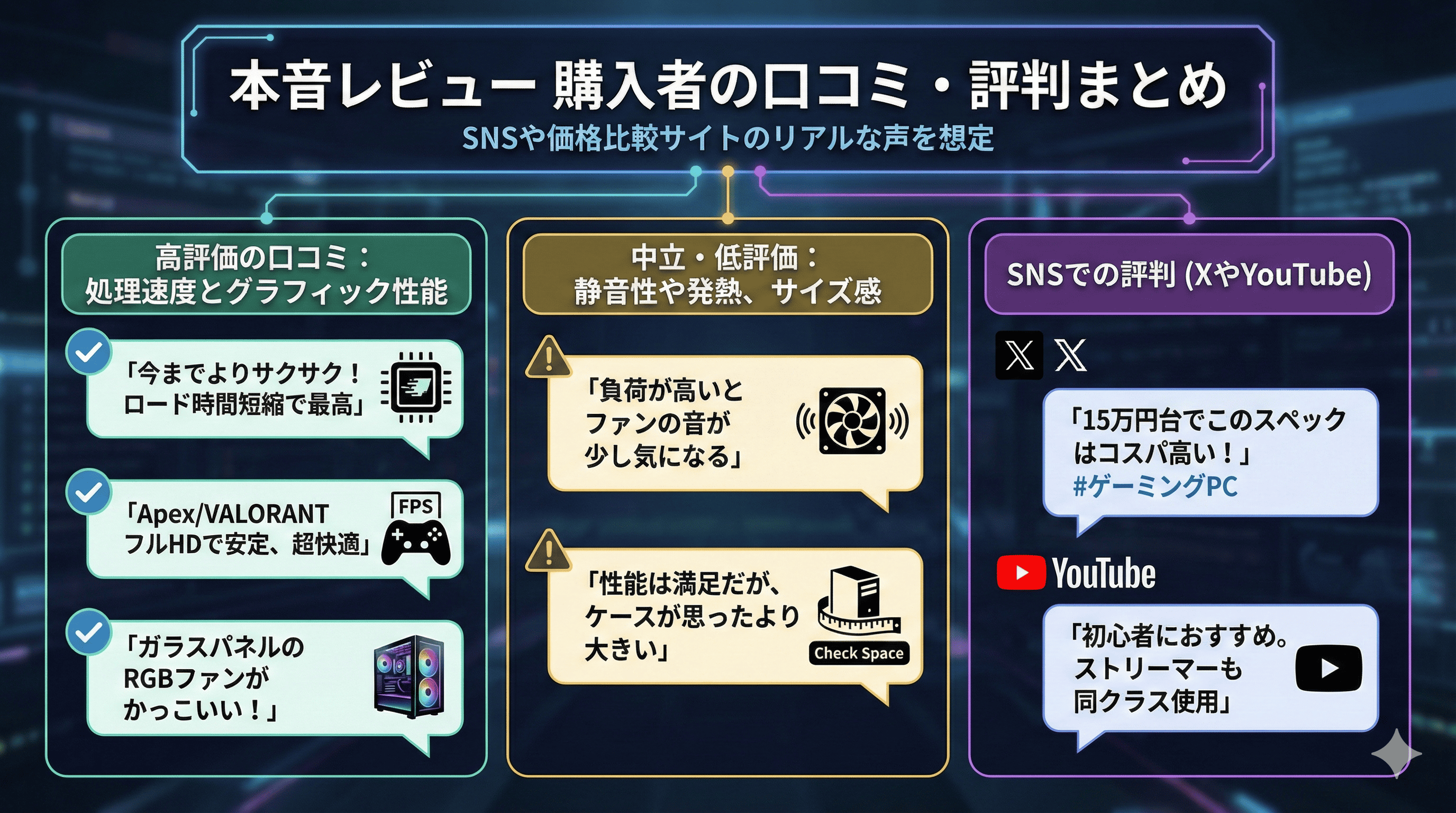 X(旧Twitter)やYouTubeでは、「15万円台でこのスペックはコスパ高い」「初心者におすすめのゲーミングPC」といった投稿が多く見られます。また、人気ストリーマーが同クラスのPC構成でゲームをプレイする動画も多く、その性能の高さがうかがえます