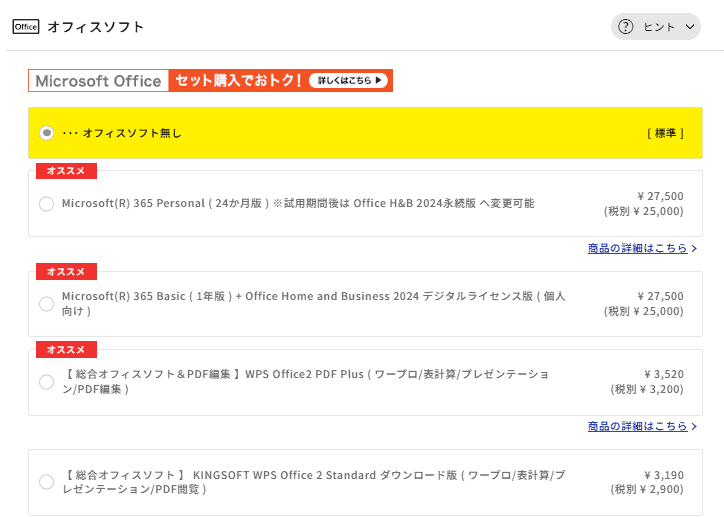 ゲームや動画を見るのが目的なら、このソフトは使いません。標準の「なし」を選んで、浮いた約2万7千円を新しいゲームやキーボード代に回しましょう。もし仕事や学校のレポートなどでWordやExcelが絶対に必要なら追加しても良いですが、あとから自分で買うこともできます。まずは「なし」でお得に手に入れるのがおすすめです。