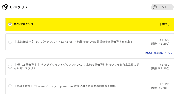 パソコンを冷やすためのジェルですが、基本的には標準のままで十分な性能があります。もし予算に少し余裕があって、「パソコンをより大切に使いたい」「少しでも熱を下げたい」という場合は、約2,000円プラスして「ナノダイヤモンドグリス」などを選ぶのもおすすめです。迷ったら標準のままで進めましょう。