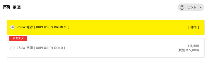 標準の「750W BRONZE」でも、このパソコンを動かすのに十分なパワーがあります。プラス5,500円で「GOLD」に変えると省エネ性能がアップしますが、ゲームの速さは変わりません。予算を抑えたいなら標準のままで大丈夫です。浮いたお金で新しいゲームを買うのがおすすめです。