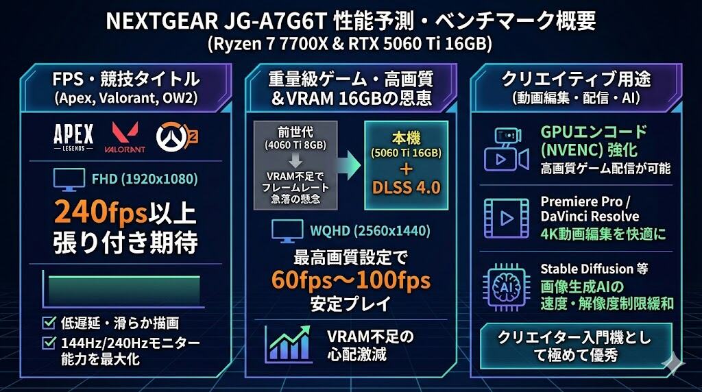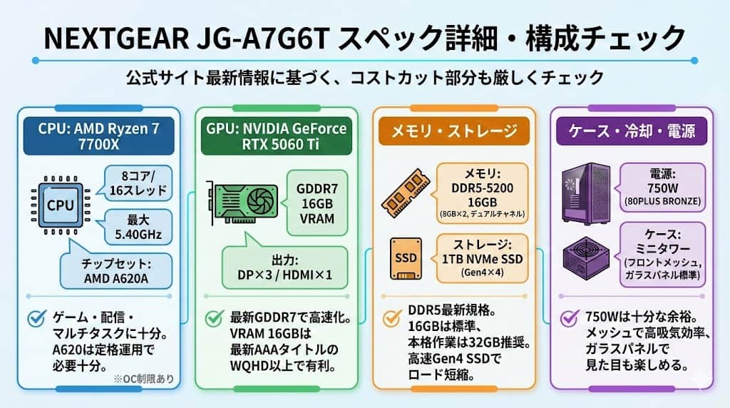 NEXTGEAR JG-A7G6T(RTX 5060 Tiモデル)の主な特徴と評価