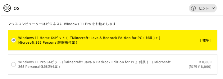標準構成のWindows 11 Homeは、ゲームや普段使いに必要な機能がすべて揃っており、ほとんどの方はこのままで問題ありません。上位のWindows 11 Pro(+8,800円)は、リモートデスクトップやBitLockerなどビジネス向けの機能が追加されますが、個人でゲームや動画視聴を楽しむ用途であれば使う場面はほぼないため、追加費用をかけてアップグレードする必要はないでしょう。