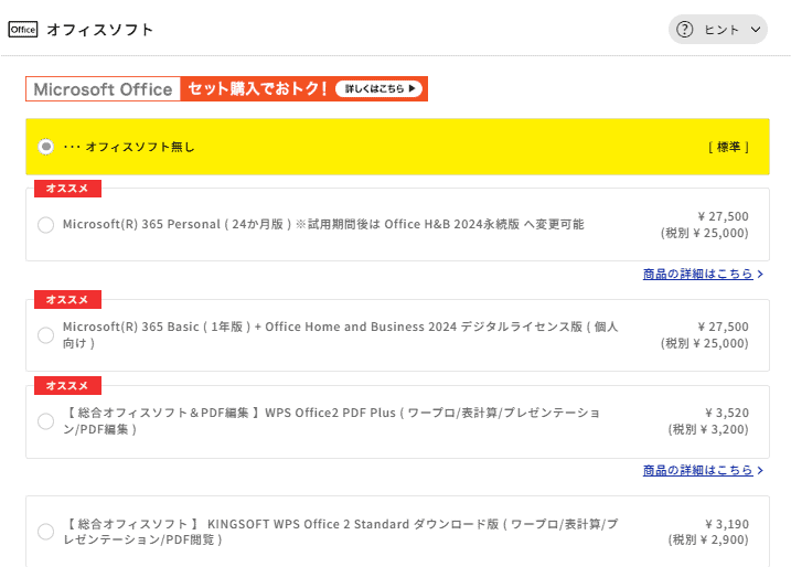 標準構成ではオフィスソフトは付属しません。WordやExcelを仕事・学校で日常的に使う方は、Microsoft 365 Personal(24か月版/+27,500円)またはOffice Home and Business 2024付きプラン(+27,500円)を選ぶのがおすすめです。