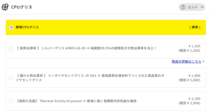 高熱伝導率のシルバーグリス(+1,320円)やダイヤモンドグリス(+1,980円)、長期間性能が落ちにくいThermal Grizzly Kryonaut(+3,190円)も選べますが、通常のゲーム用途であればコストをかける優先度は低めです。