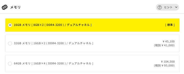 64GB(+104,500円)は3Dモデリングなどプロ向けの作業でない限り必要になることはほぼありません。まずは16GBで使い始めて、空きスロットが2つあるので必要になったら自分で増設するのも賢い選択です。