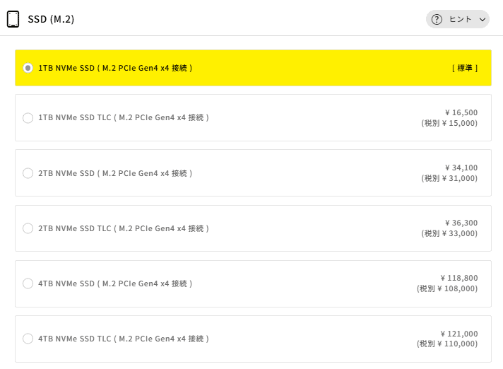 コスパ重視なら2TB(+34,100円)へのアップグレードがおすすめで、容量に余裕が生まれゲームの入れ替えの手間も減ります。より書き込み耐久性の高いTLCタイプの2TB(+36,300円)も価格差が小さく好選択です。4TB(+118,800円~)は動画素材を大量に扱うクリエイター向けで、一般的なゲーム用途では必要ありません。