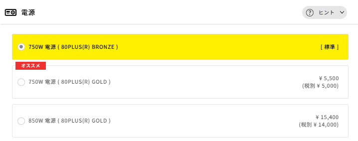 長く使うなら検討する価値があるでしょう。850W GOLD(+15,400円)は将来より消費電力の大きいグラフィックボードに換装する予定がある方向けですが、現構成のまま使い続けるなら優先度は低めです。