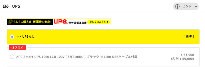 UPS(無停電電源装置)は、停電や瞬断が発生した際にPCへ一時的に電力を供給し、安全にシャットダウンする時間を確保するための機器です。選択肢のAPC Smart-UPS 1000(+64,900円)は信頼性の高い製品ですが、ゲーム用途がメインの方にとっては優先度の低いオプションです。