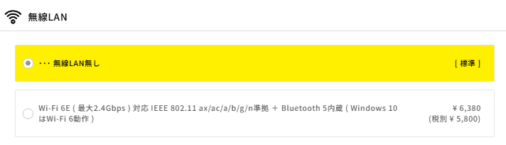 本機は標準では無線LAN(Wi-Fi)が搭載されていません。有線LAN接続ができない環境の方は、注文時にカスタマイズで無線LANを追加するのを忘れないようにしましょう。