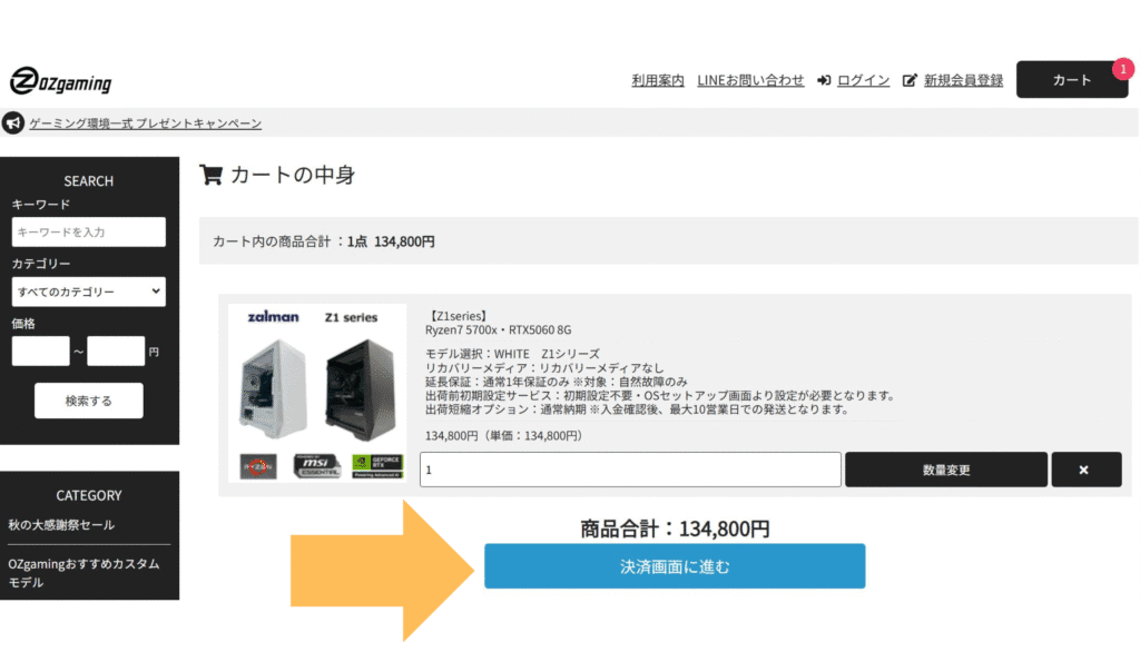 OZgaming公式サイトで買いたい製品をカートに入れて注文の確認画面に進みます。