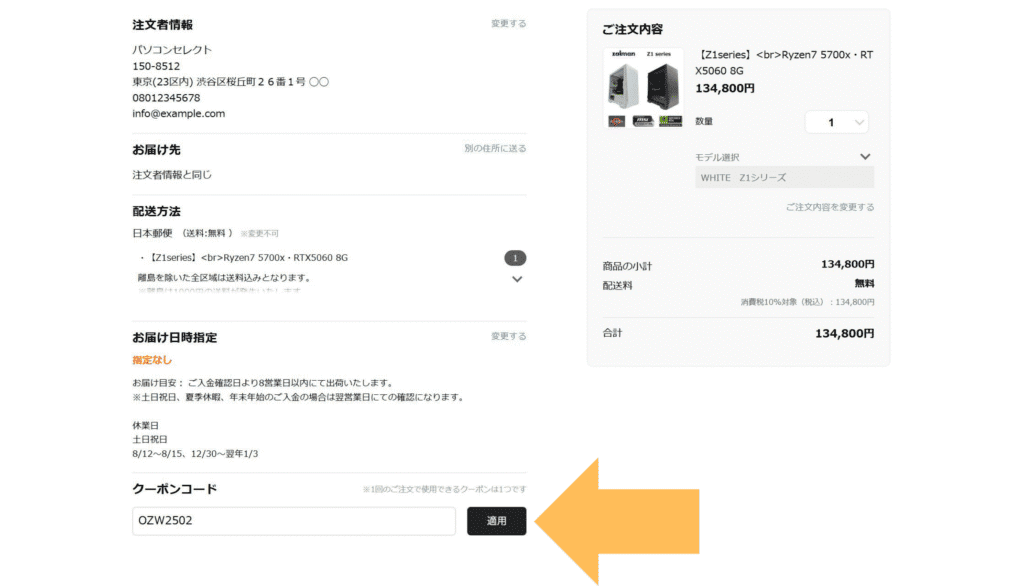 注文の確認画面で最初に確認したクーポンコードを入力します。