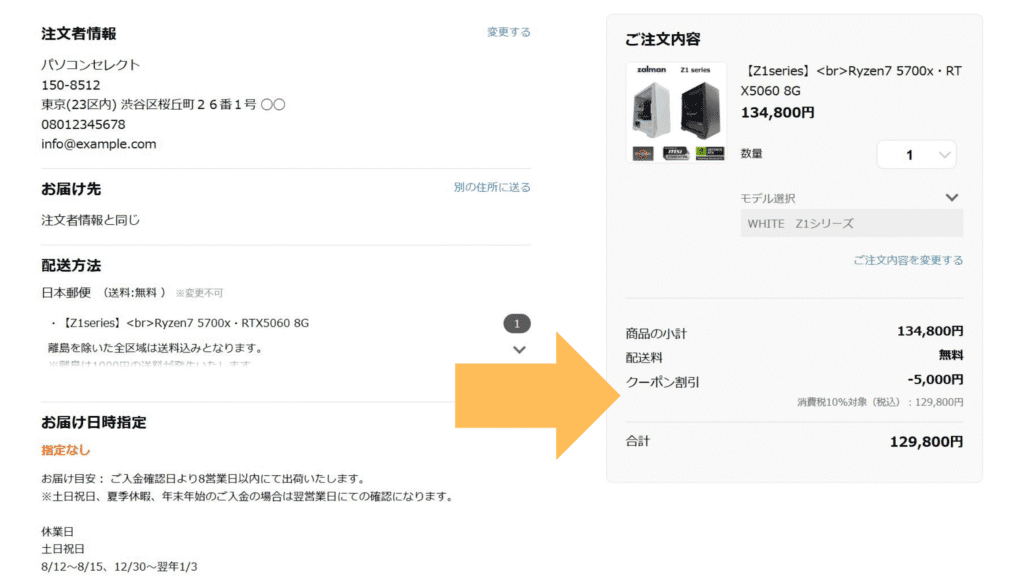 注文金額からクーポン分の割引が適用されているか確認しましょう。