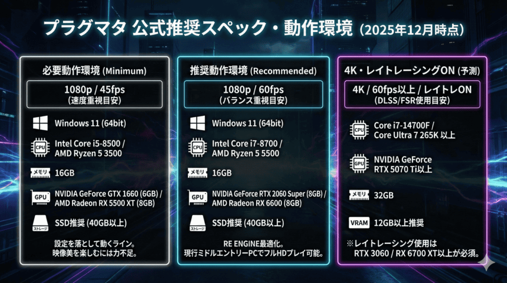Steamで配信中の体験版「PRAGMATA Sketchbook」およびストアページで公開されている動作環境は以下の通りです。