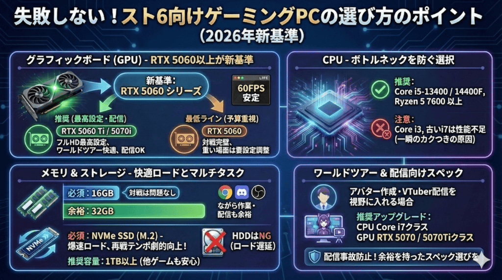 スト6用のPCを選ぶ際に、見るべきポイントをパーツ別に解説します。