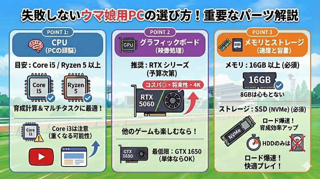 ストレージ: SSD(NVMe接続) が必須です。HDD(ハードディスク)のみのPCは選んではいけません。ウマ娘は画面切り替えが多いゲームなので、SSDにインストールすることでロード時間が爆速になり、育成効率が劇的に上がります。