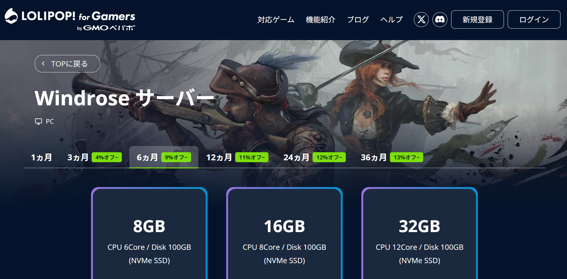WindroseはUE5ベースでメモリ消費が大きいゲームなので、Windrose向けのプランは8GBからスタートします。公式の推奨は16GBプラン(〜10人対応)。長期契約にすると最大29%オフになるので、しばらく遊ぶ予定ならまとめ契約がお得です。