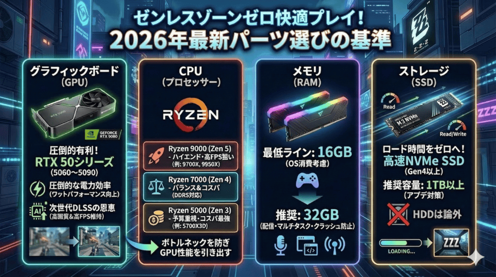 現在のゲーミングPC市場において、ZZZを快適にプレイするために選ぶべきパーツの基準を解説します。